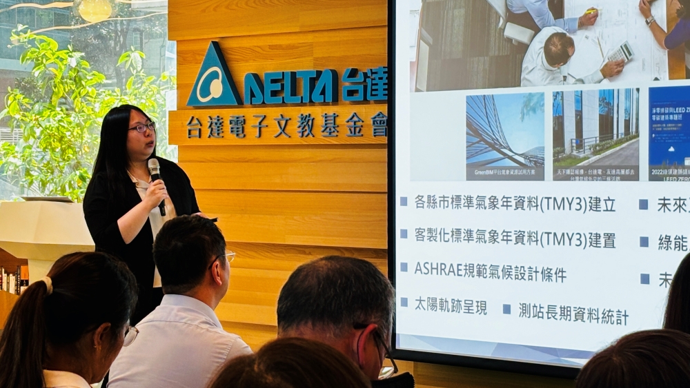 The event invites three representatives respectively from the International Climate Development Institute (ICDI), Delta Energy Management System Department, and Delta Research Center. They introduce how Delta makes use of weather forecasts to help our Chungli Plant 5 to achieve energy savings by 18%, how an office building becomes the first one to reach nearly zero carbon in Taiwan under the Building Energy-Efficiency Rating System, and how digital twin assists our data center, production line, and logistics in reducing energy consumption.