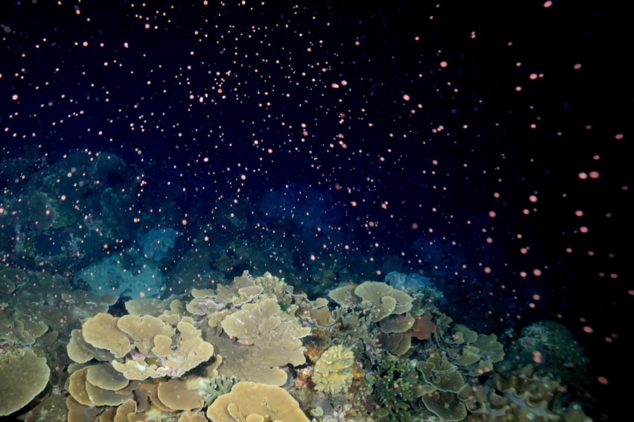 Corals exhibit a large-scale spawning phenomenon as one of their reproductive strategies. Since corals cannot move, sexual reproduction relies on the rapid release of a large number of eggs in a short period of time. Fertilization occurs externally in seawater, after which the zygotes settle on the sea floor and eventually develop into corals. The Kenting area itself has a unique hot spring water temperature, which is a potential reason for maintaining the coral ecology well and even helping to enhance the coral recovery ability. The site chosen for the Foundation's live stream is outside the water intake of the Maanshan Nuclear Power Plant in Kenting. The diversity and coverage of coral species are high, making it an excellent place to observe spawning phenomena.